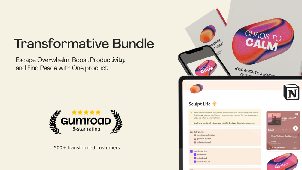 Our Notion Template integrates seamlessly with our book, offering mindfulness and gratitude practices, affirmations, and much more in your own organized digital space.
